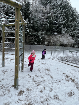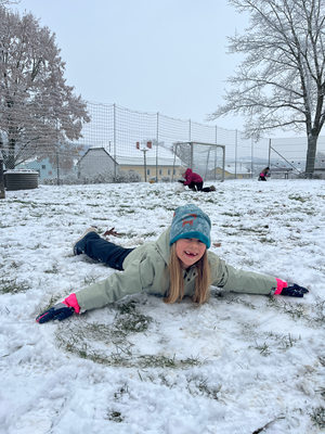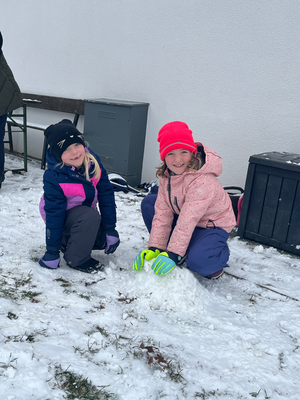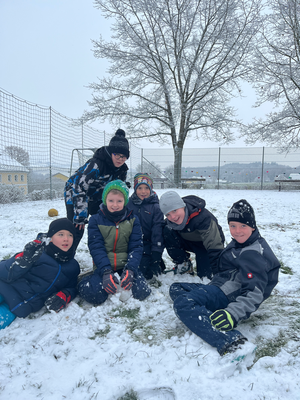 Die 1. Klasse durfte die Kindergartenkinder im neuen Kindergarten besuchen und mit ihnen gemeinsam im Garten spielen.