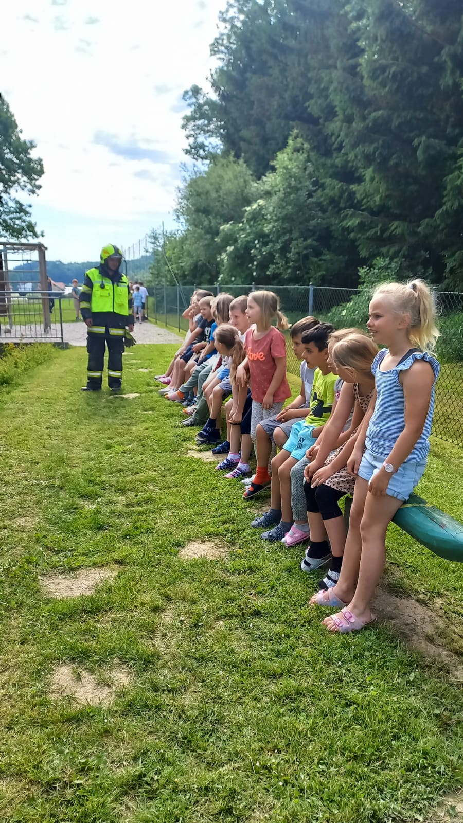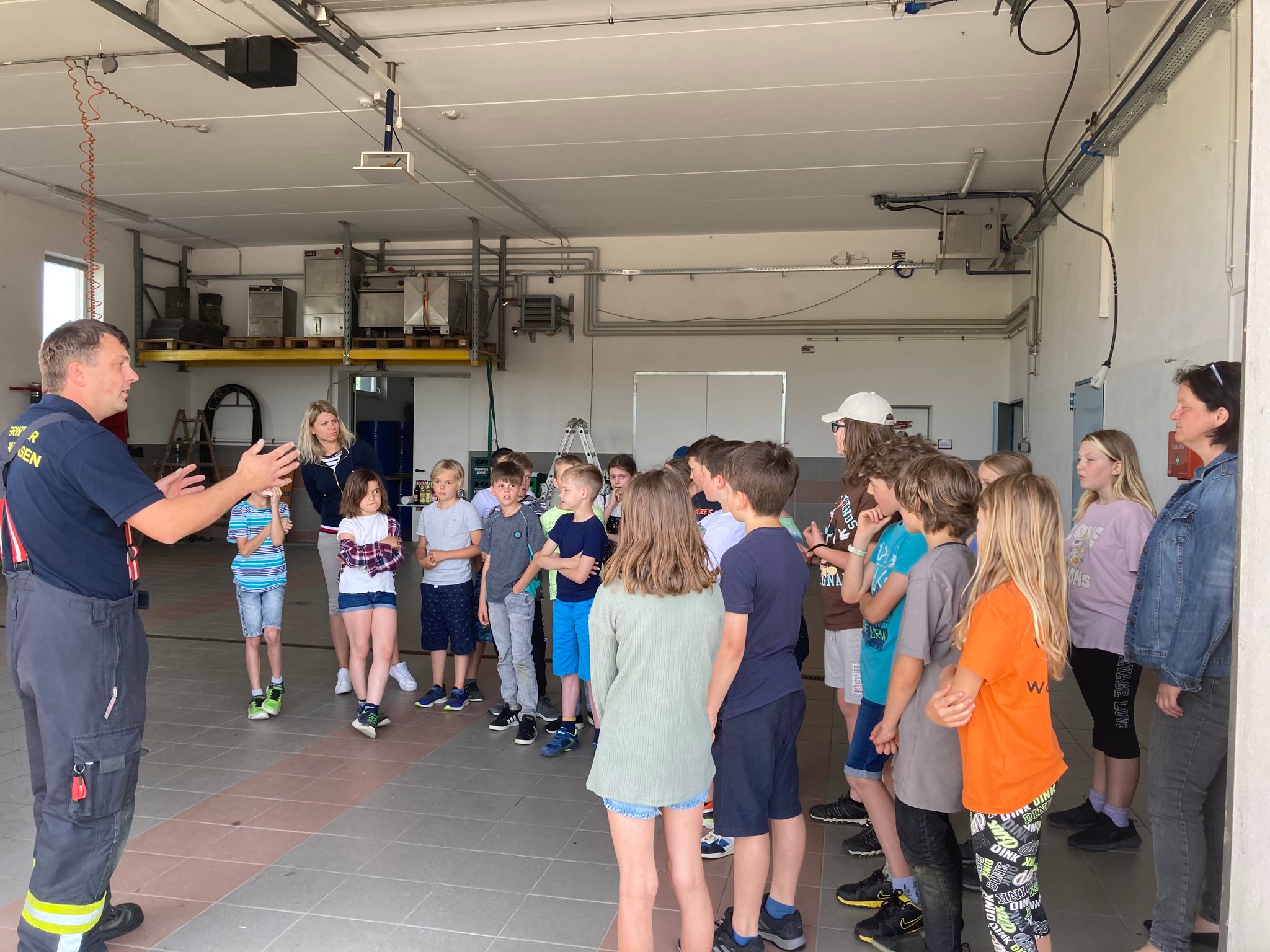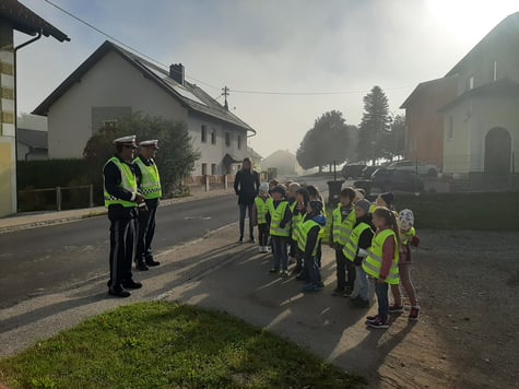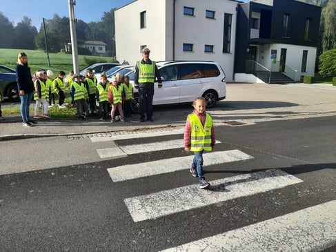Die Kinder der 1. Klasse durften mit den Polizeibeamten das richtige Überqueren der Straße üben.