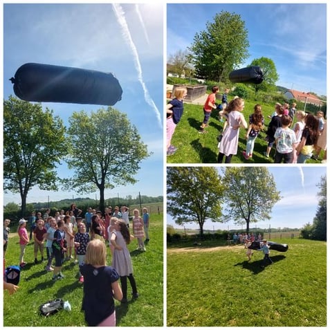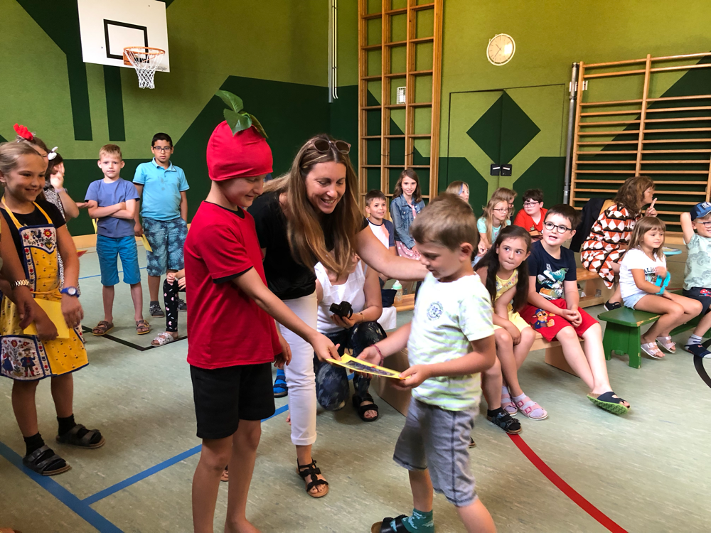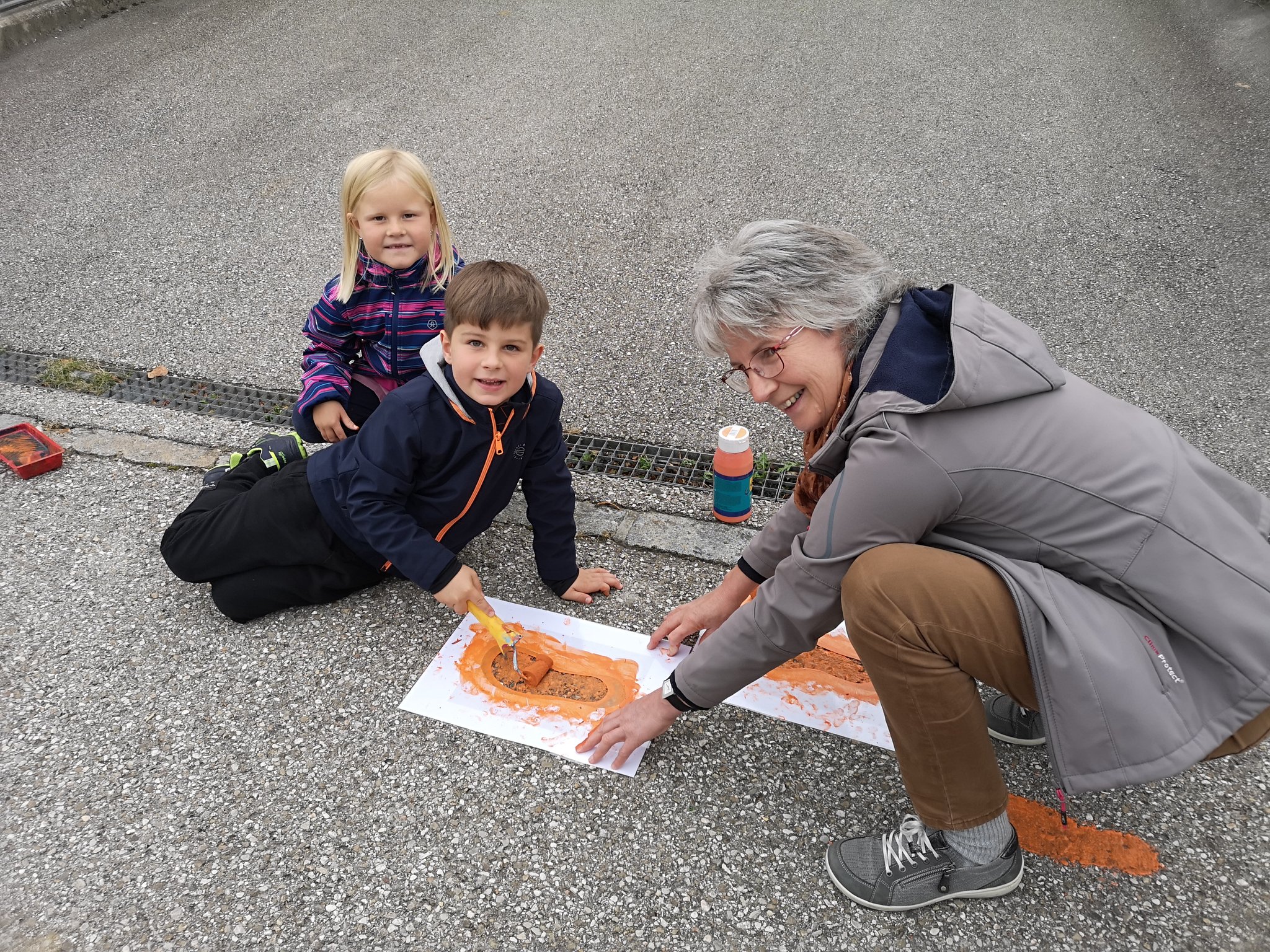 Wir gestalteten Hinweisschilder für den Elternparkplatz, bemalten mit Straßenkreiden die gesperrte Straße und erstellten große Aufstellfiguren. Die dritte Klasse nahm an der "Apfel-Zitronen Aktion" teil und die Verkehrsteilnehmer*innen erhielten, je nach Geschwindigkeit, einen Apfel oder eine Zitrone und einen Spruch von unseren Schüler*innen.