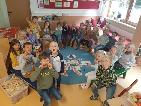 Wir lernen über den Apfel. Gemeinsam sehen wir uns die Teile des Apfels an. Da darf natürlich auch eine leckere Apfeljause nicht fehlen.