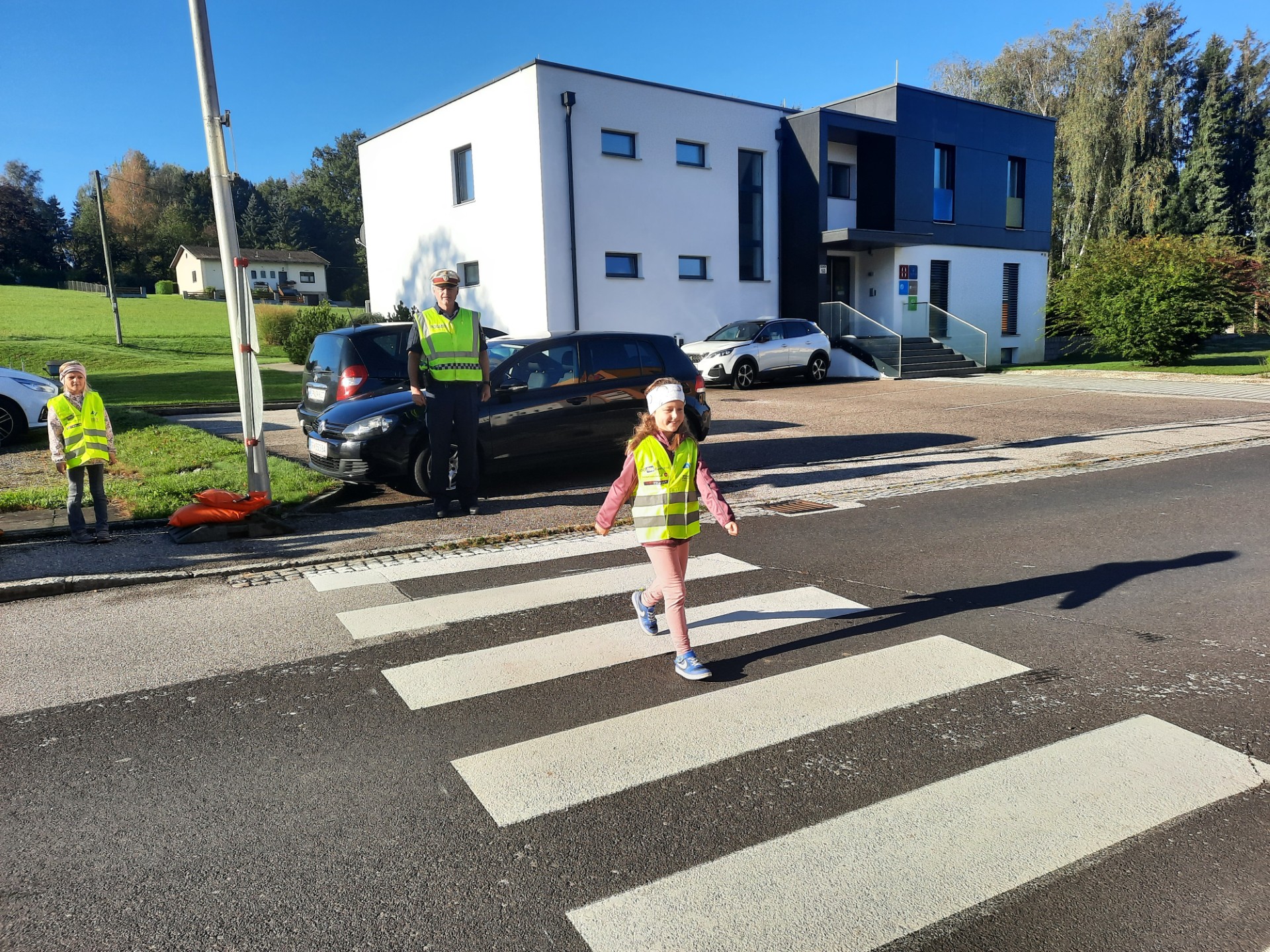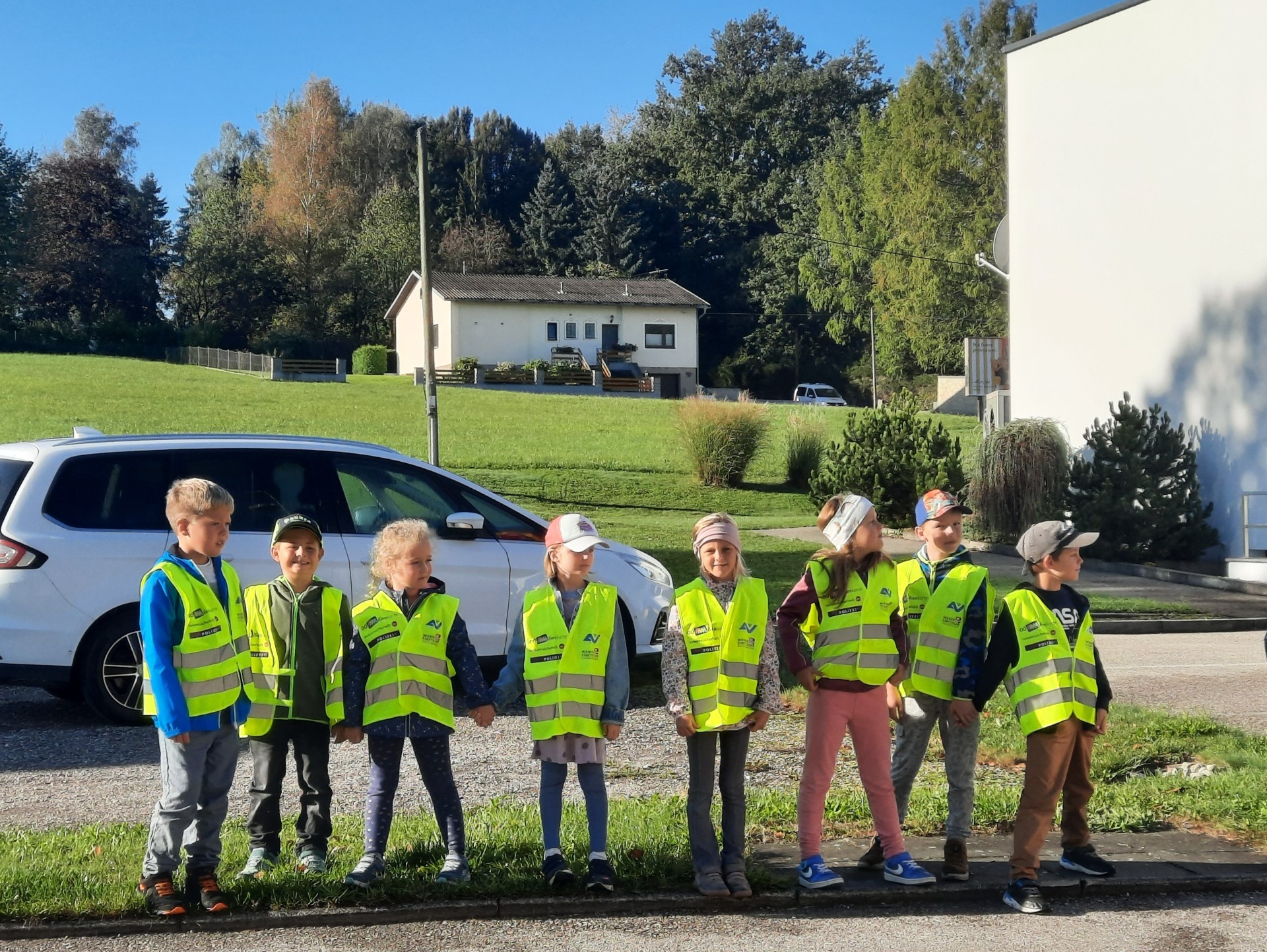 Die Erstklässler lernen mit Hilfe der Polizei das Überqueren der Straßen.