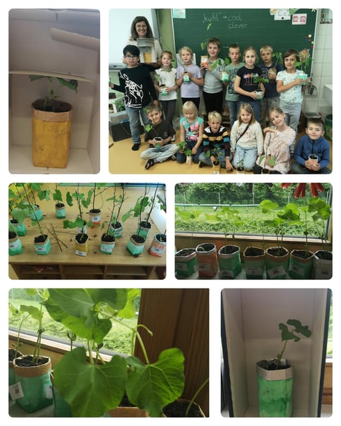 Die Kinder der ersten Klasse pflanzten Bohnen in recycelte Tetrapacks. Sie konnten beobachten, wie die Pflanzen keimen und wachsen. Dabei entdeckten sie, dass die Pflanzen Licht, Wasser und Luft brauchen. Um dies zu veranschaulichen, führten sie zwei spezifische Experimente durch: