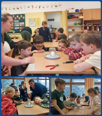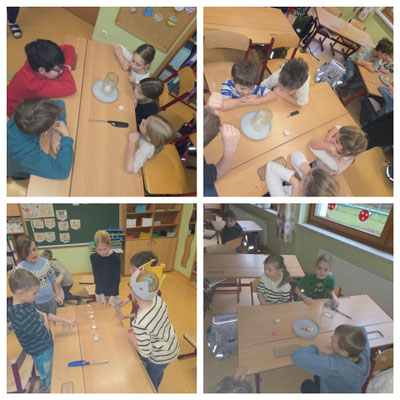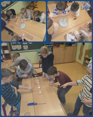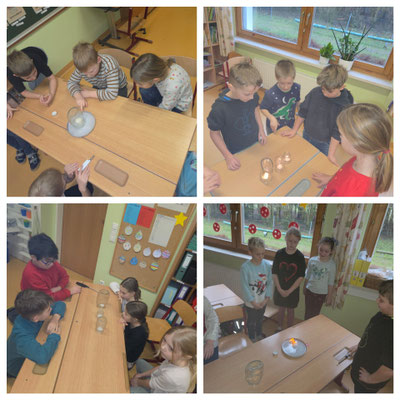 Gemeinsam wird erforscht, dass Kerzen Sauerstoff benötigen, um zu brennen, und dass nicht alle Materialien brennen.